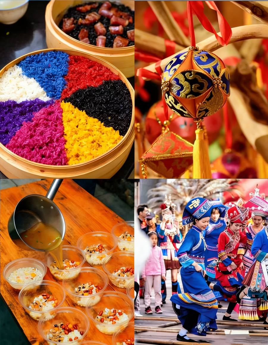 گانے کے علاوہ، لوگ پودوں کے رس سے رنگے ہوئے پانچ رنگوں کے چپکنے والے چاولوں کو تیار کرکے، کڑھائی والی گیندوں کو پھینک کر، بانس کے کھمبے کے ناچ ناچ کر، اور کانسی کے ڈرم بجا کر جشن مناتے ہیں۔